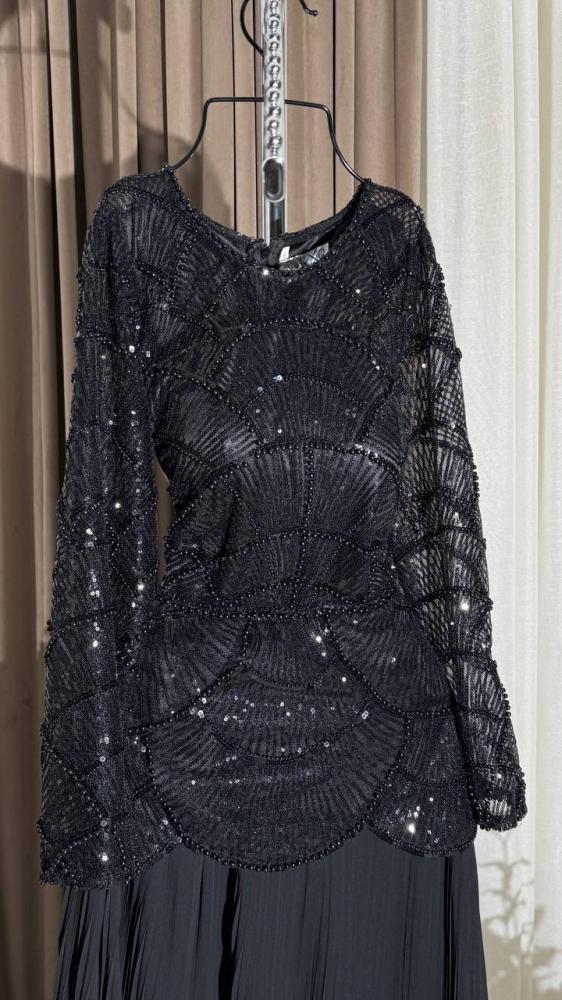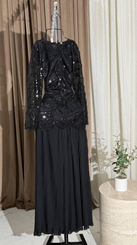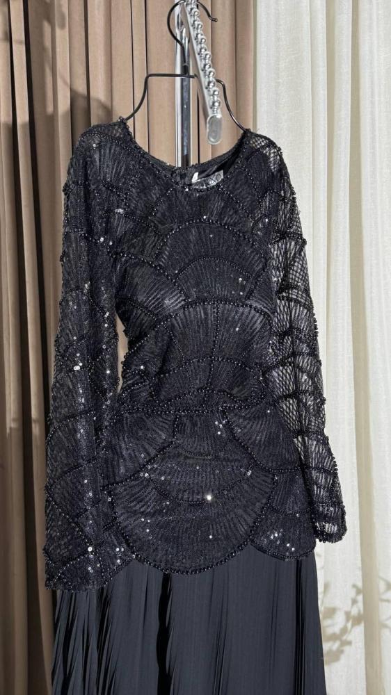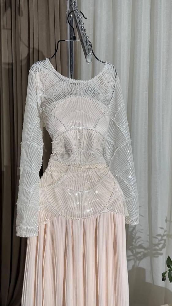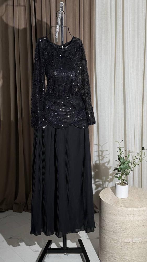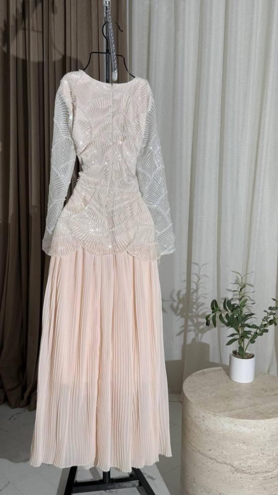 فستان راقٍ بأكمام طويلة وتصميم أنثوي ناعم، يجمع بين الجزء العلوي المطرز بالترتر اللامع بشكل هندسي أنيق، والتنورة البليسيه الواسعة تضيف له لمسة رومانسية. مثالي للمناسبات الفاخرة ولمظهر هادئ وفخم في آنٍ واحد.