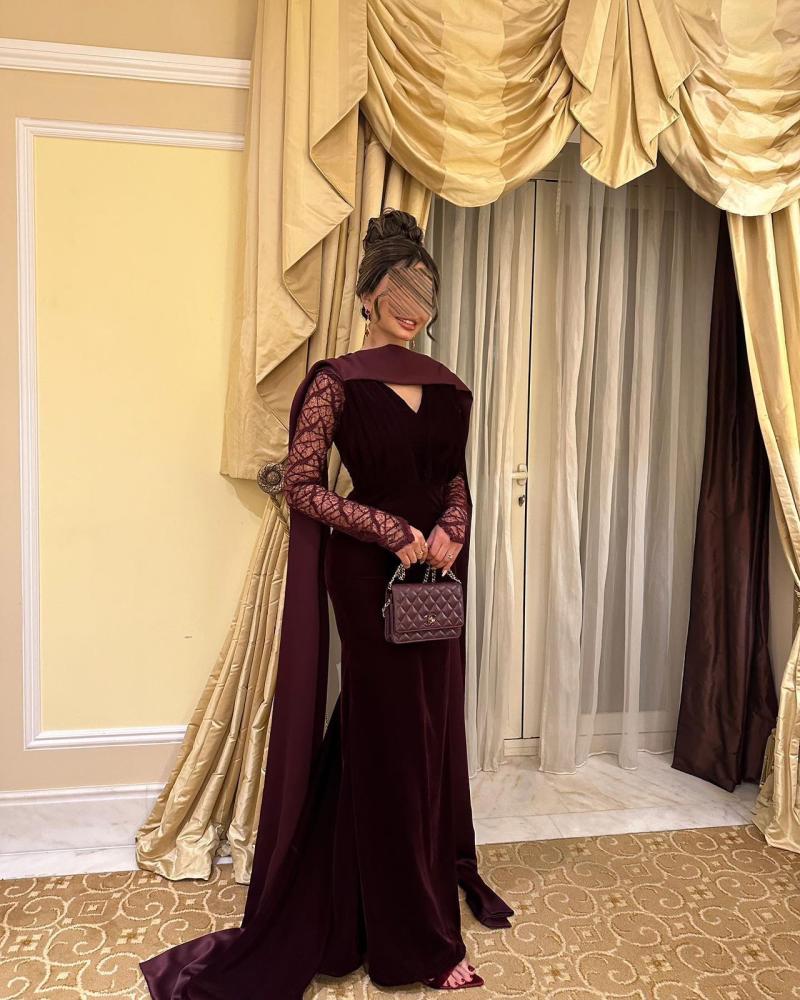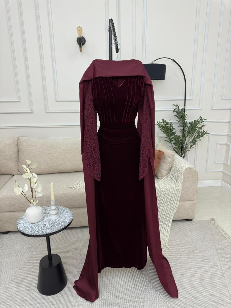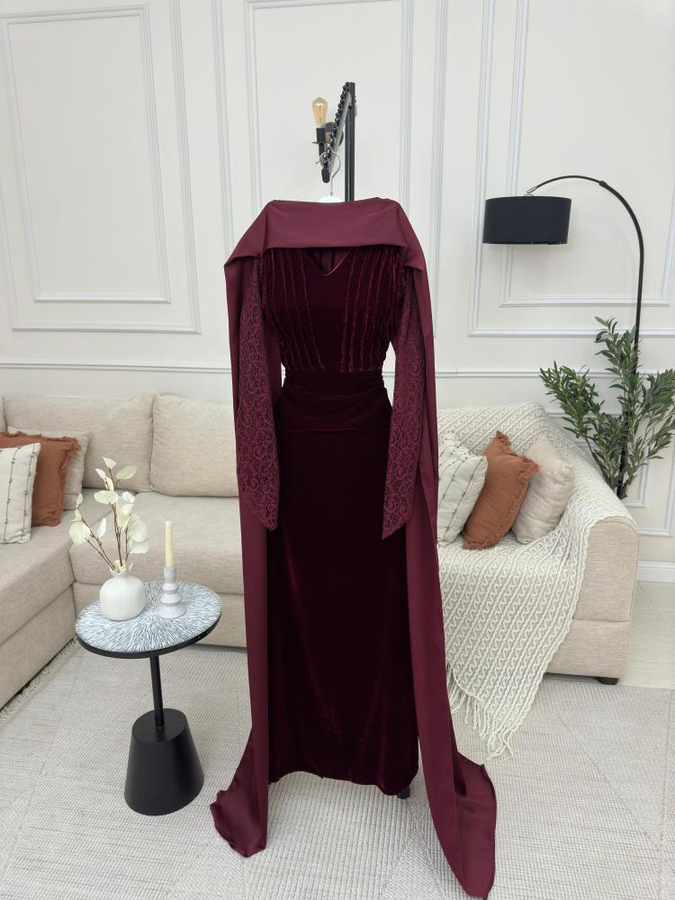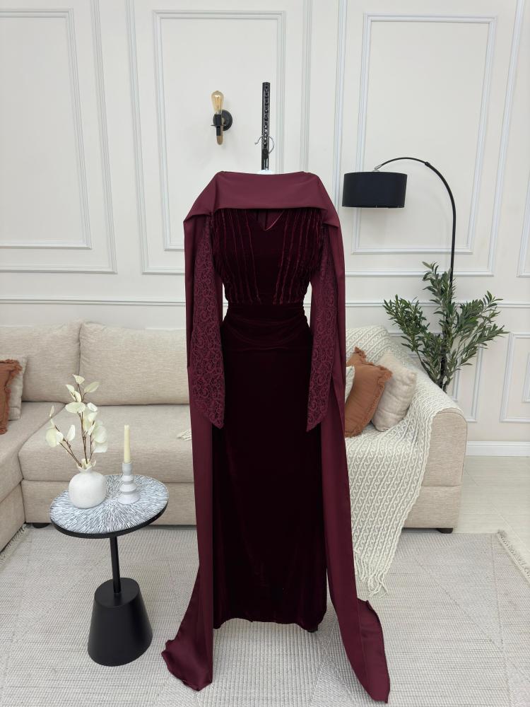 مواصفات الفستان:نوع الفستان : سهرة انيقنوع القماش : مخمل كوريطريقة التفصيل : فستان سهرة انيق بشال بخامة كريب واكمام شفافه