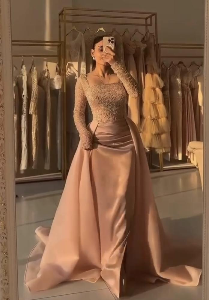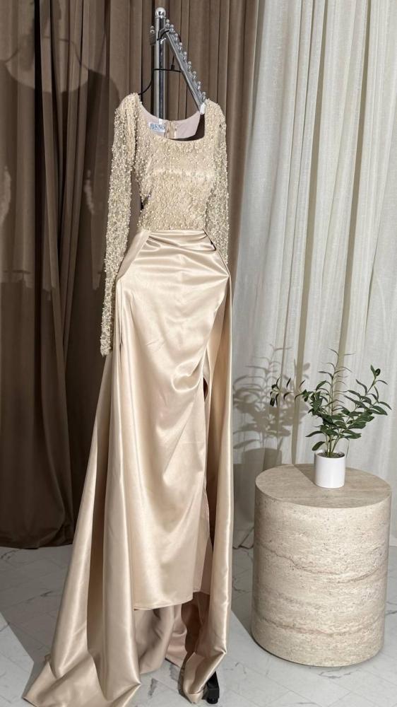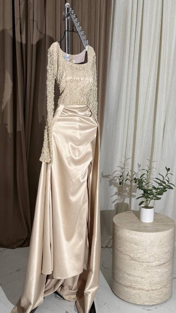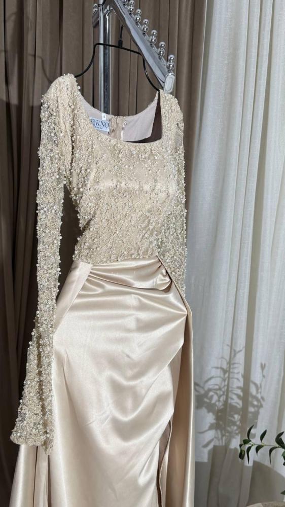 تصميم راقٍ وفخم جدًا. الجزء العلوي يأتي بأكمام طويلة من قماش مطرز بالكامل بالخرز والتفاصيل اللامعة التي تضيف لمسة فاخرة وأناقة لافتة. أما الجزء السفلي فهو مصنوع من قماش ساتان حريري باللون الشامباني اللامع، مع قصّة أنيقة وانسيابية تنسدل بشكل فاخر وتضفي على الفستان حضورًا ملكيًا.