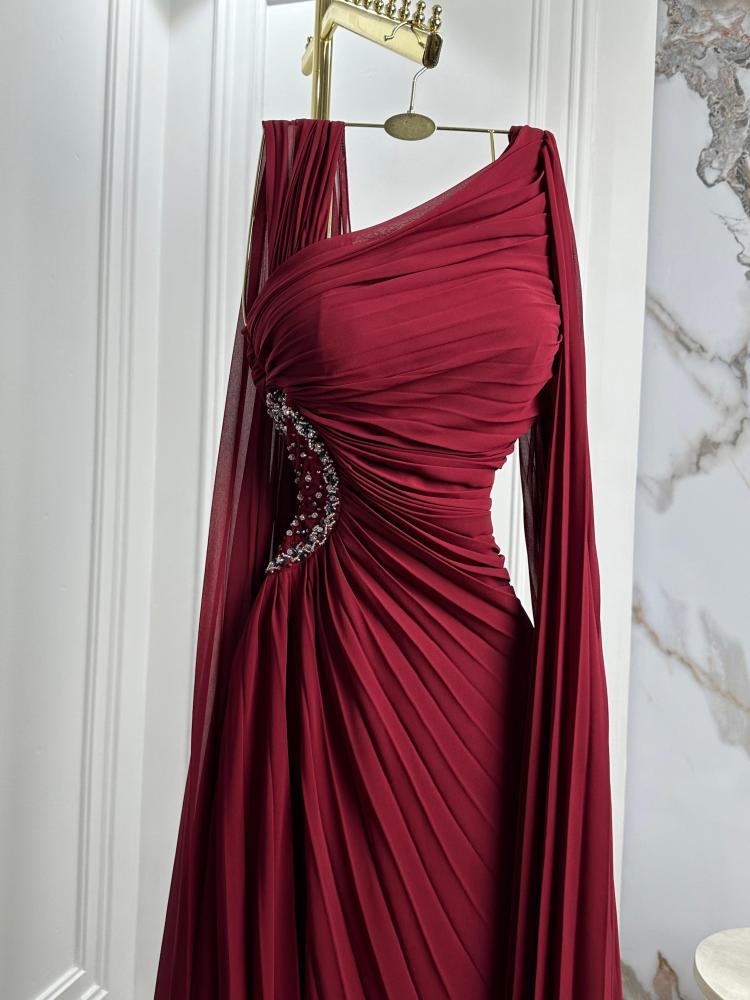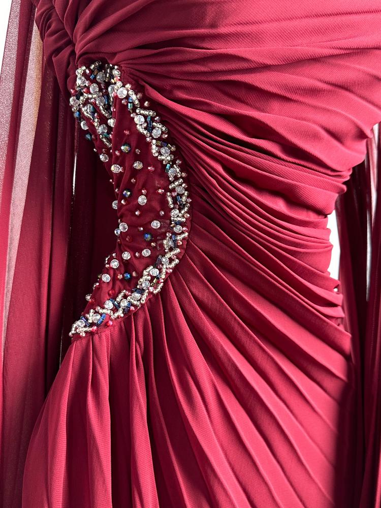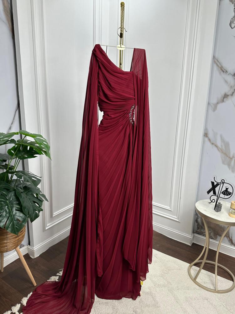 مواصفات الفستان:نوع الفستان : راقينوع القماش : شيفون جورجيتطريقة التفصيل : فستان سهرة واقي بكمام طويله وكسرات مع حبك مع جانب الفستان تطريز يدوي