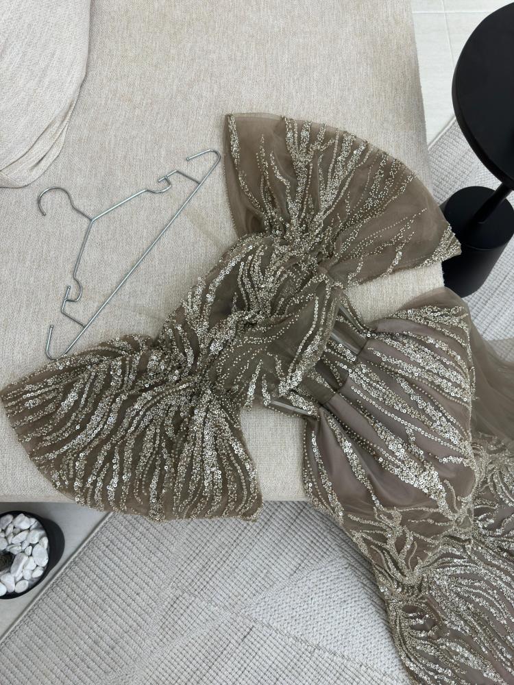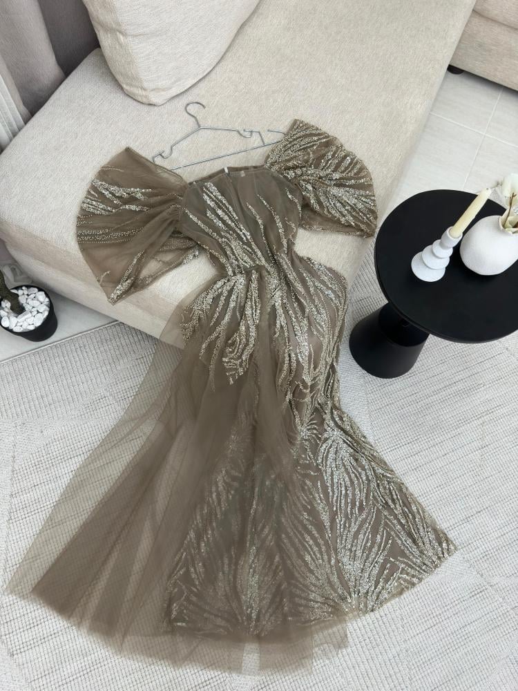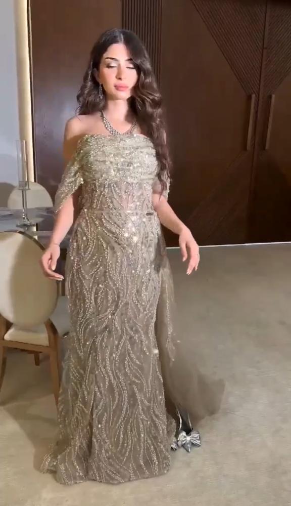 مواصفات الفستان:نوع الفستان : سهرة انيقنوع القماش : تل كوريطريقة التفصيل : فستان سهرة انيق مطرز بخرز مع فتحة من الاسفل