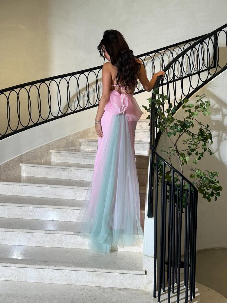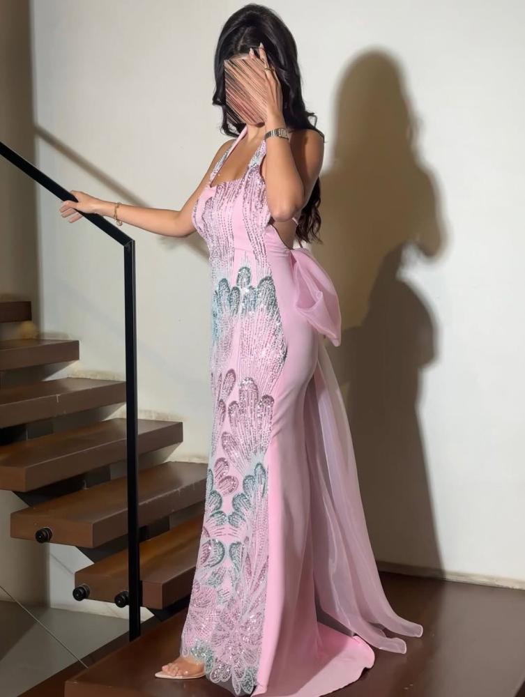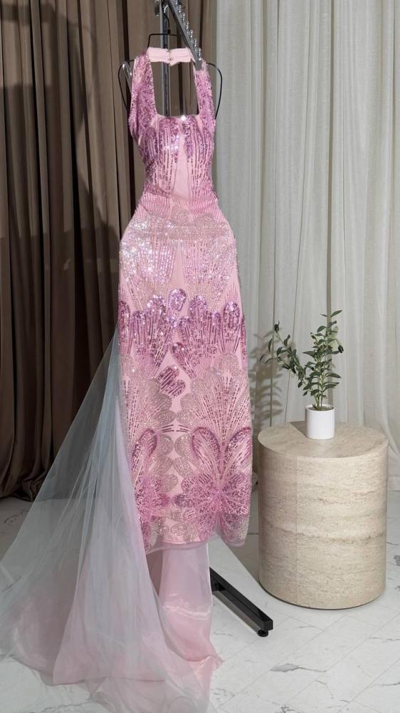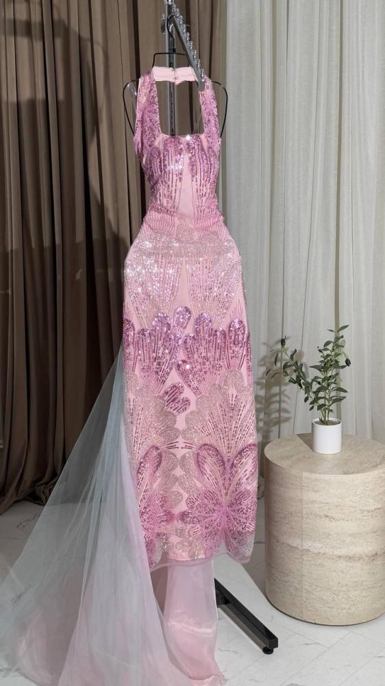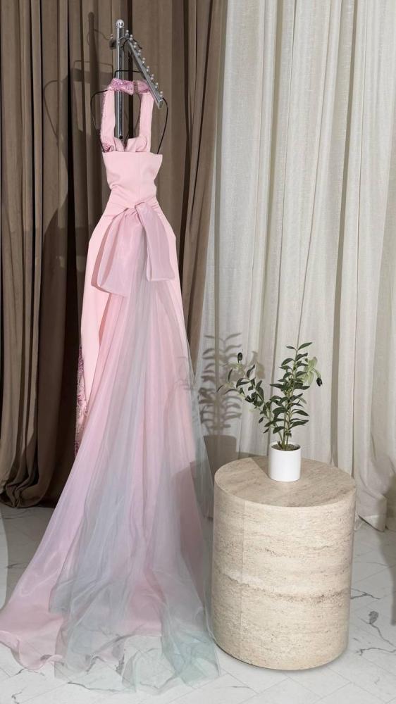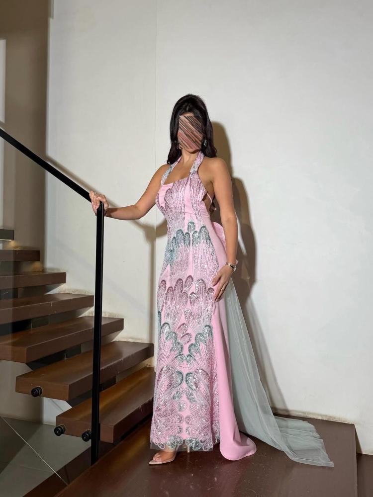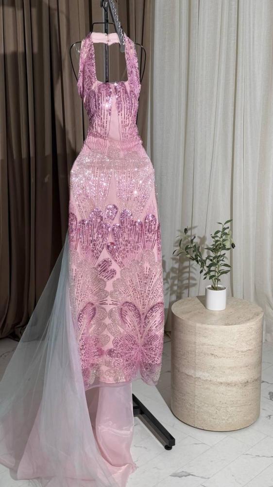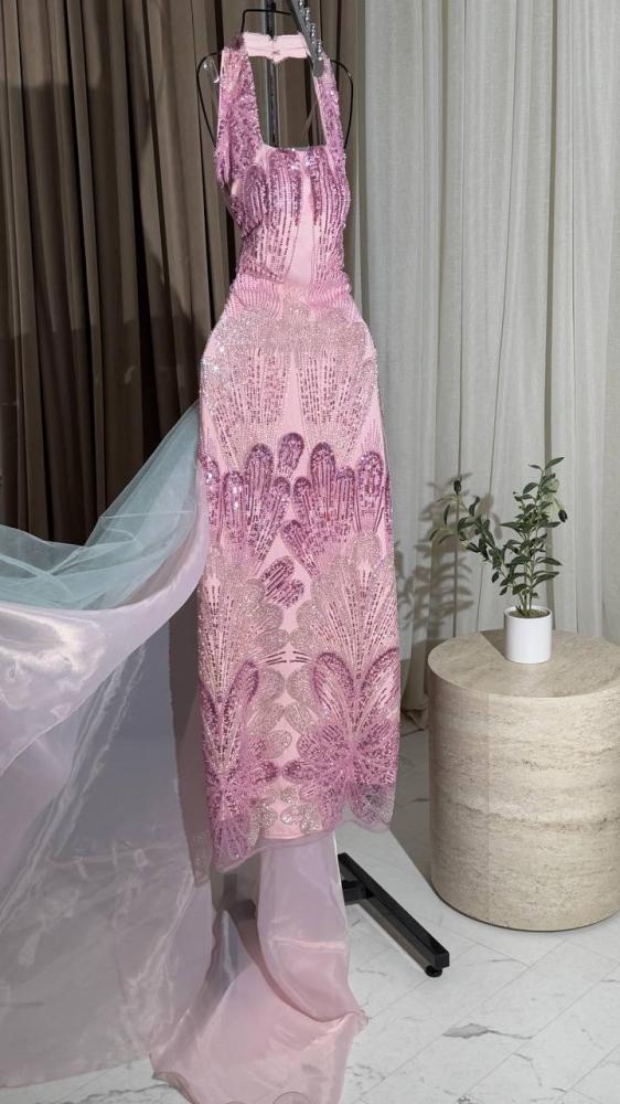 تألقي بإطلالة تخطف الأنظار مع فستان لحن الأمواج، المصمم بلون وردي ناعم يرمز للأنوثة والرقة، مزدان بتطريز فاخر متلألئ يتدرج كأمواج البحر في انسجام مبهر بين الفضي والأخضر الفاتح. يأتي بقصة هالتر أنيقة تكشف الكتفين وتبرز جمال القوام، مع طبقة شيفون انسيابية من الخلف تضيف لمسة درامية ساحرة. فستان مثالي للسهرات والمناسبات الراقية، يجمع بين الفخامة والرقي في كل تفاصيله