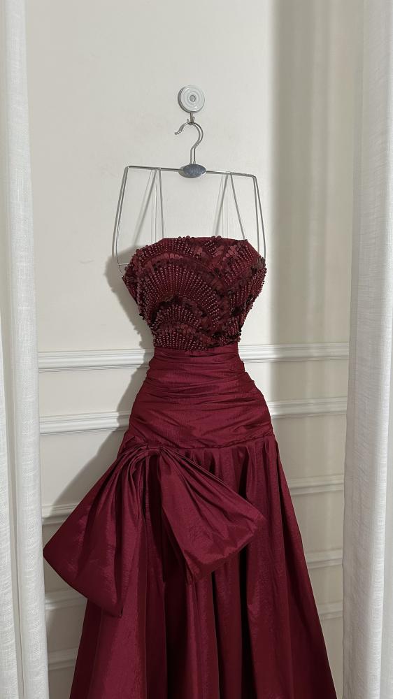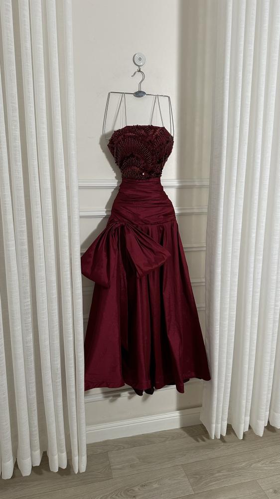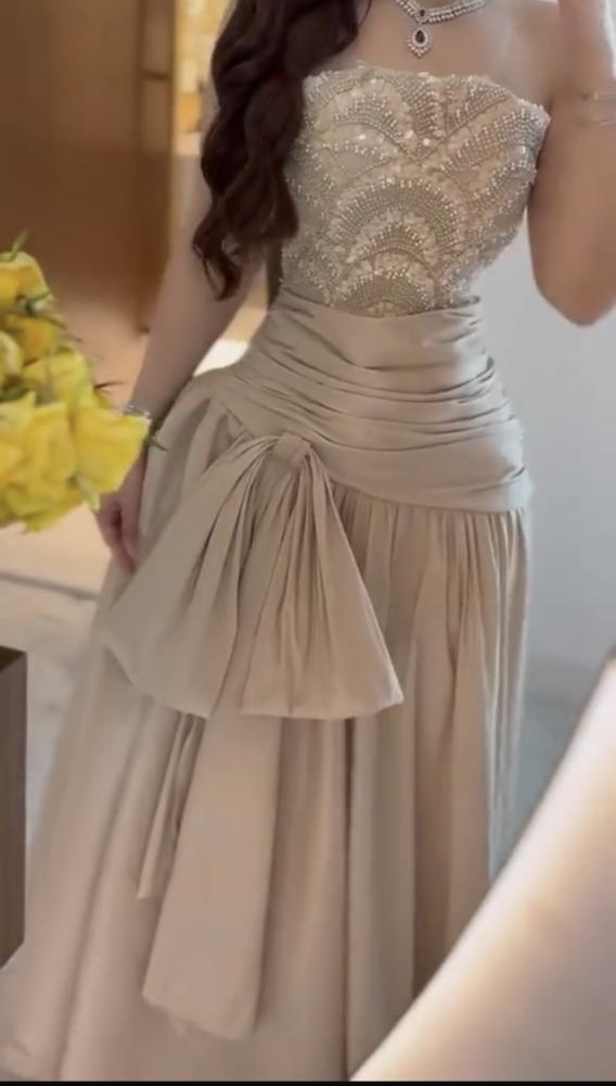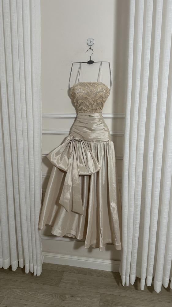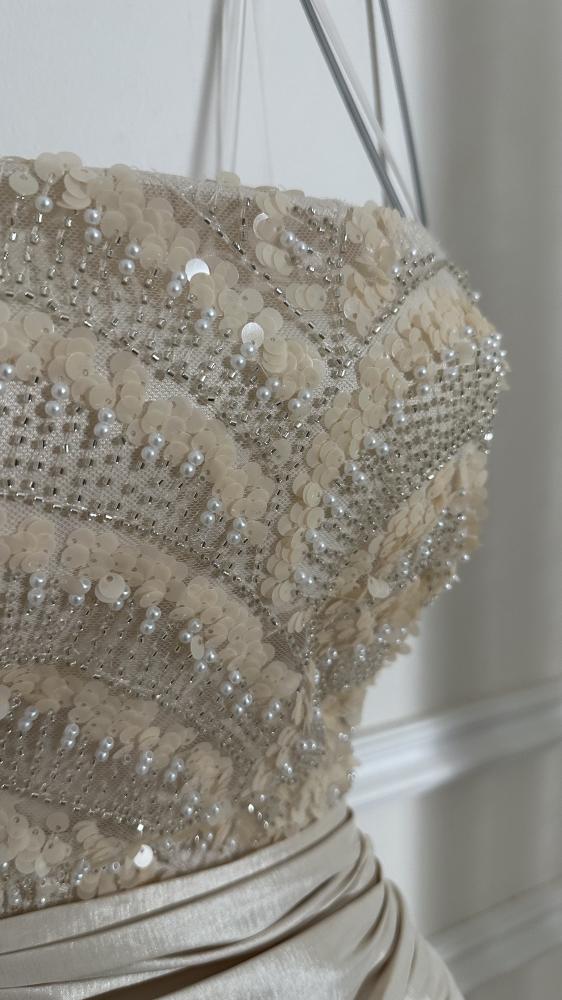 - التنورة مصنوعة من قماش ساتان لامع بلون شامبين، مع حركة انسيابية تمنح الفستان فخامة.